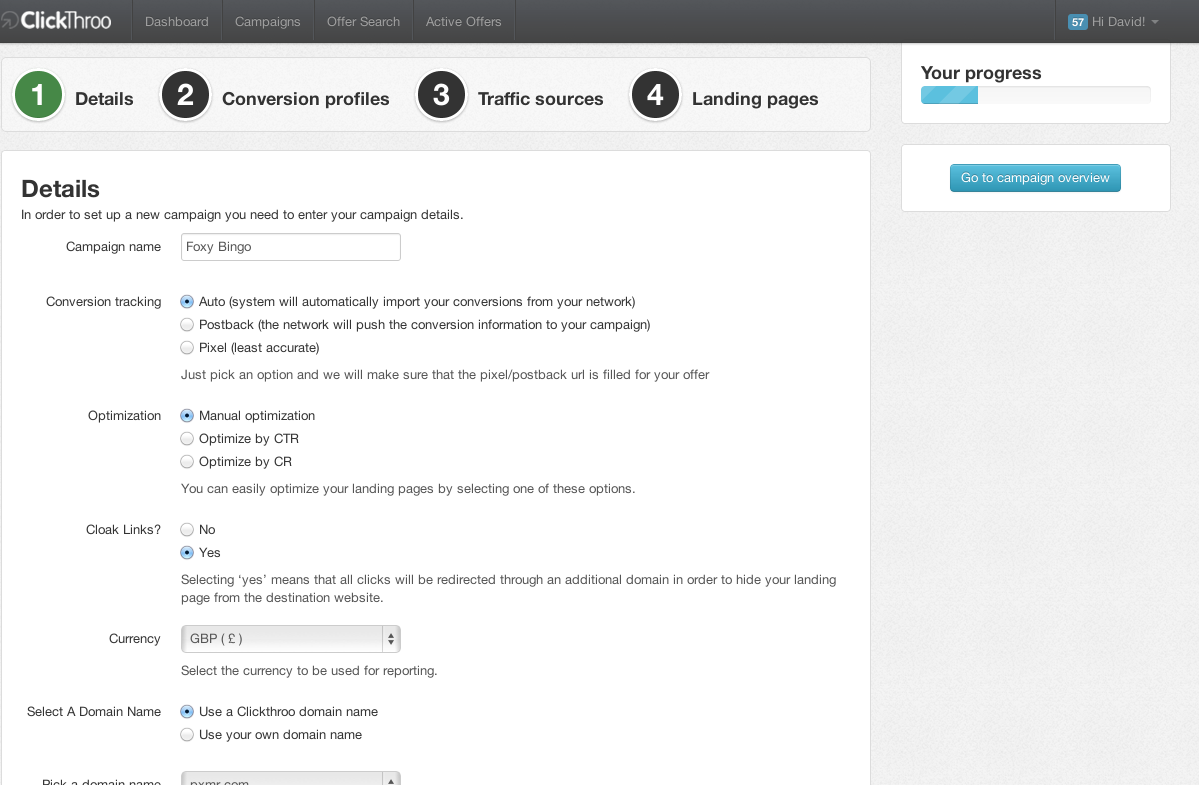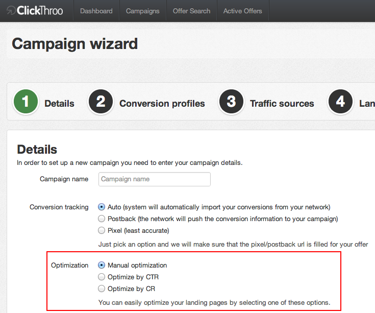 Creating a campaign is monkey-proof. Just follow the Campaign Wizard, answer the questions and you are good to go. Set the name, optimization preferences, tracking settings, link cloaking options, campaign currency, domain name preferences (may as well use one of ours, right?), and traffic source costs. Simple, quick, and intuitive. There is no need to set-up tracking because this is automated with all integrated networks. Yes - you heard that right!