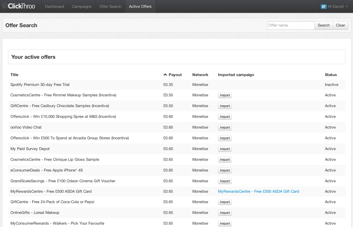 Find the offer you would like to run and click ‘import’. The details of the account are now pre-populated in the Campaign Wizard including name, network, payout and your choice of link URL. Edit any aspect to your hearts content.